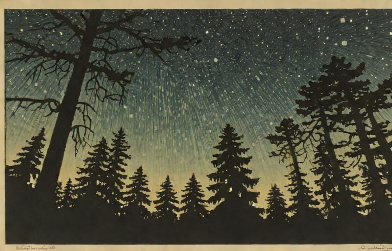 Into the night we went. Into the forest we moved, along tracks and crooked paths, between the trees and moss, past branches and trembling streams, beside rocks and fallen trunks whose blackened bark housed fruiting spores. The pines watched, guarding fate’s many threads. They saw us move. They noticed where Emmi stopped, the incapable chambers of my heart threatening to end it all.